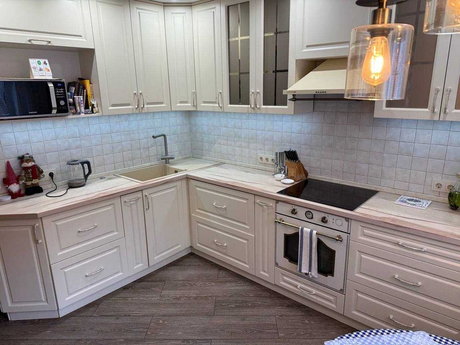 Балкон засклений. Кухня виготовлена на замовлення з якісних матеріалів: фарбовані МДФ фасади, фурнітура Blum, сучасна вбудована техніка. Для максимального комфорту встановлений подрібнювач відходів у мийці.