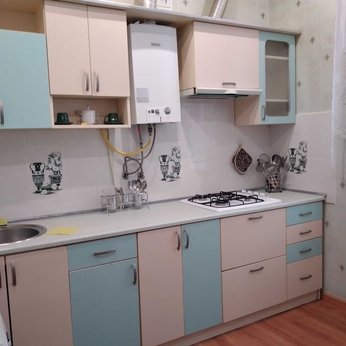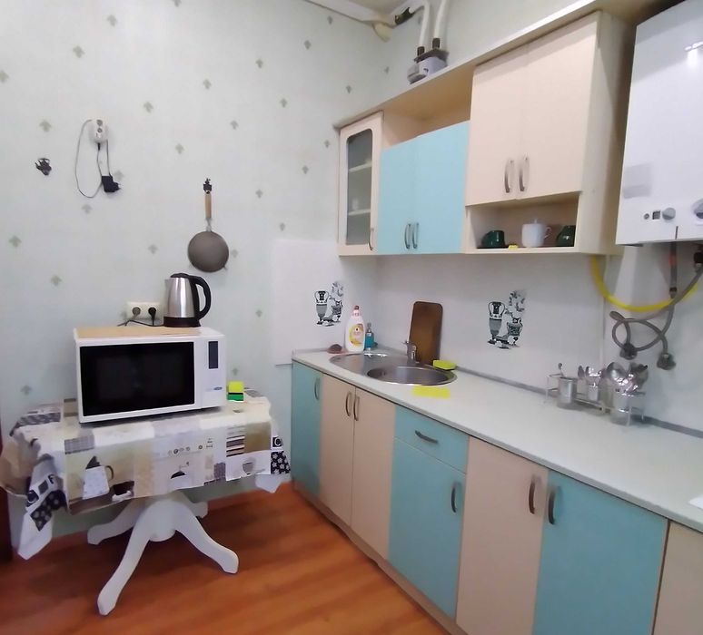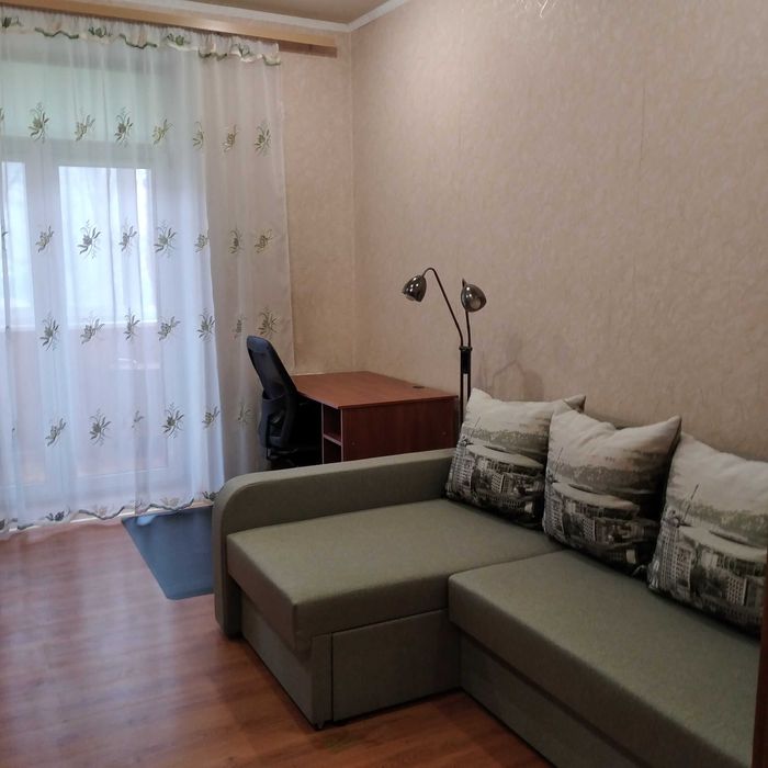 В квартирі передпокій, дві окремі кімнати (15 та 16 кв.м), суміжний санвузол з кутовою ванною, кухня 8 кв.м, обладнаний балкон з освітленням. Загальна площа квартири 51 кв.м, централізоване опалення, газова колонка та варочна панель, з побутової техніки холодильник, пральна машина, мікрохвильова піч, електрочайник, кондиціонер, телевізор, масляний обігрівач. Шафи-купе в передпокої та великій кімнаті, книжкові та платяні шафи, два нові двоспальні розкладні дивани в обох кімнатах, письмові столи, вбудована кухня, обідній стіл, необхідний набір посуду, фен, праска з прасувальною дошкою, сушарка для білизни. На вікнах тканеві ролети. Інтернет від Волі. Встановлені лічильники газу та води, електролічильник двозонний.