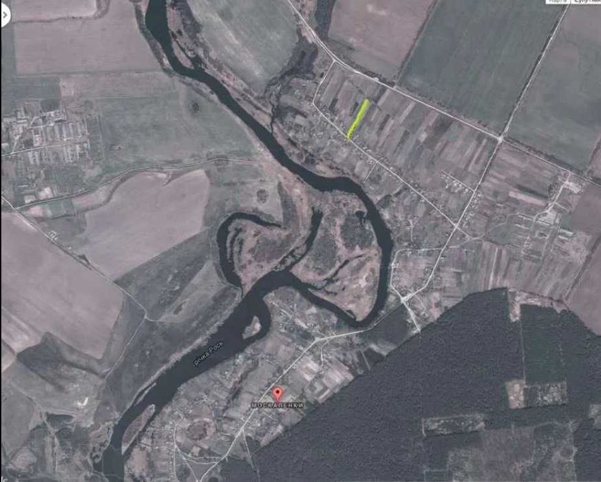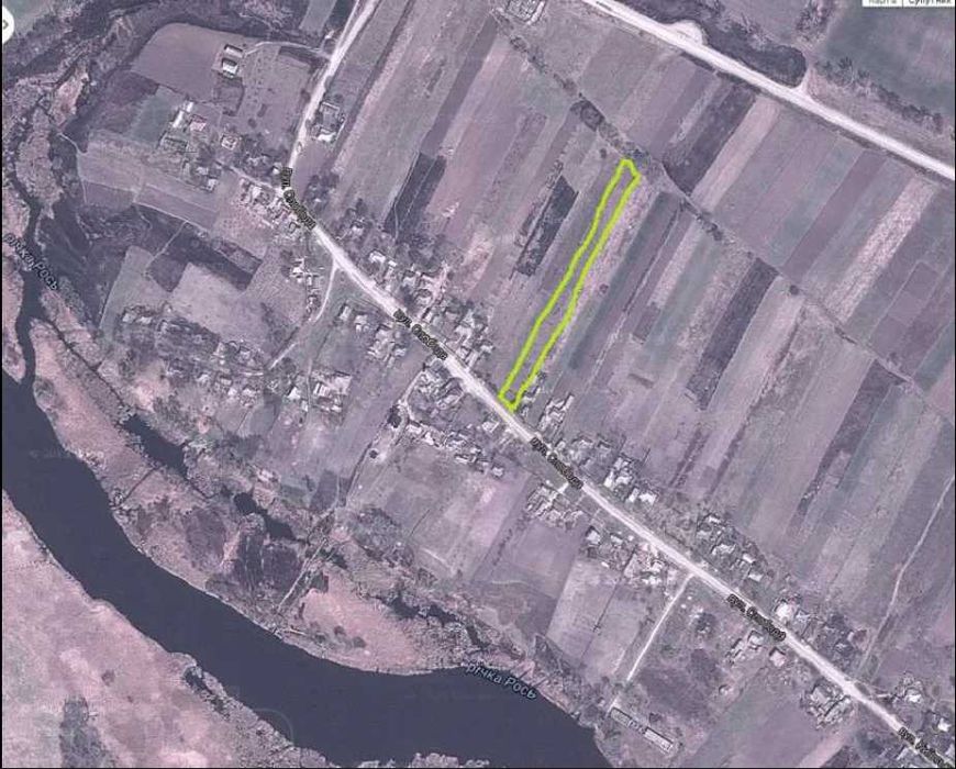 Мальовнича місцевість, відмінний клімат, поруч (через 200 метрів від ділянки) річка Рось, ліс, озеро, 34,5 соток (25 - будівництво + 9,5 ОСГ).
