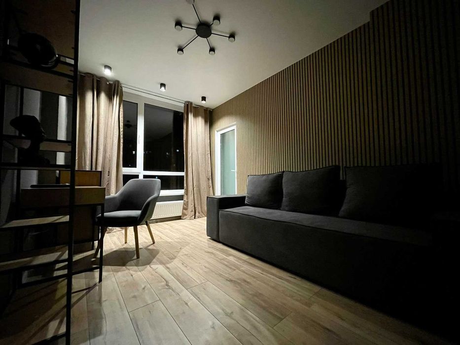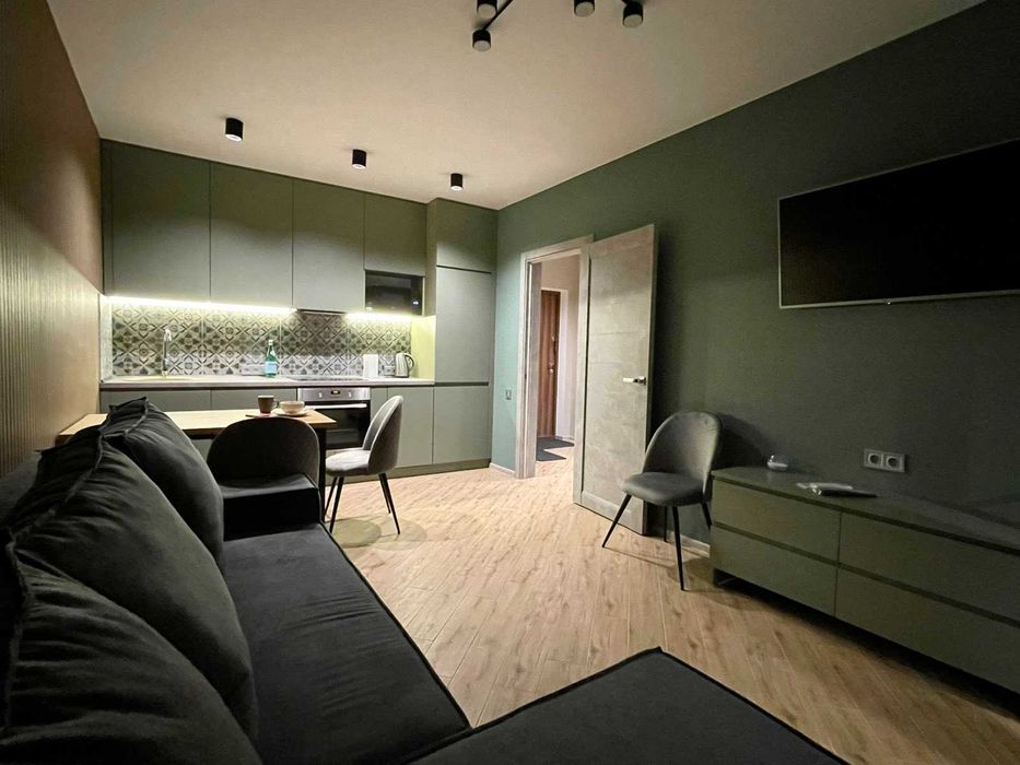 Апартаменти не плутайте з 1к квартирами, наші складаються із 2 кімнат + кухня-студія + гардеробна (євро трьошка). Перша кімната - спальня. Друга кімната - кабінет-гостьова з диваном розкладним. Третя кімната - кухня-студія з диваном та панорамною лоджією обладнану робочим місцем.
