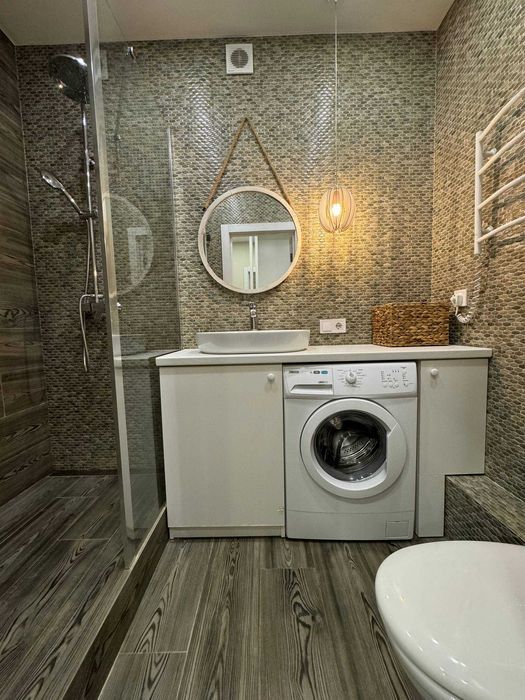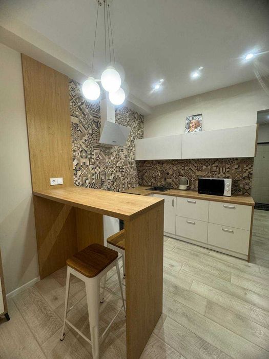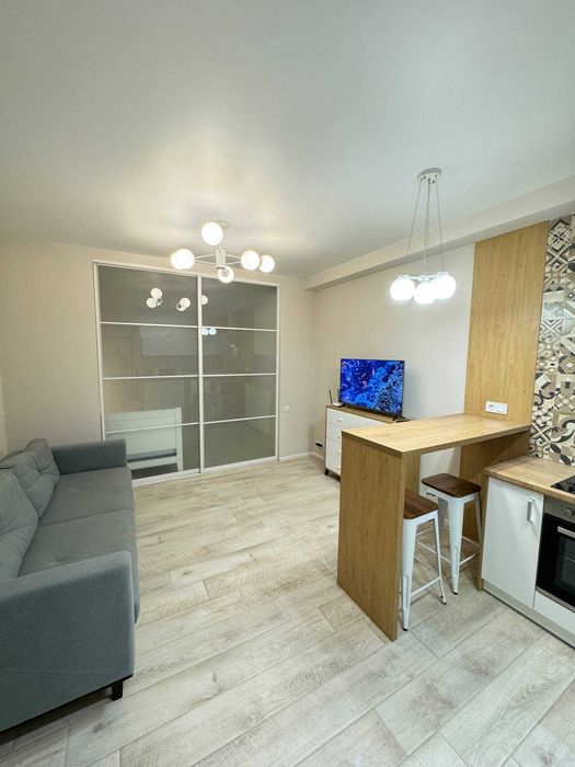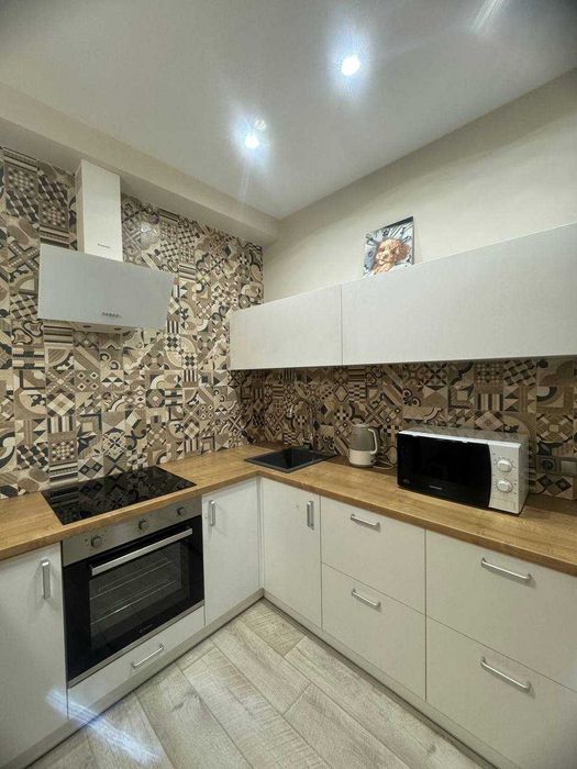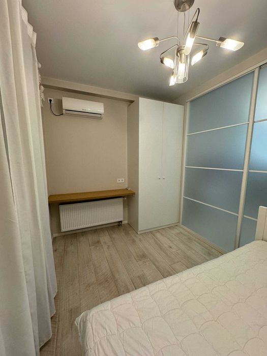 Вбудована кухня , холодильник, електро поверхня, духова шафа, витяжка кондиціонер, телевізор мікрохвильова піч, чайник. Санвузол сумісний , бойлер, пральна машина, душова кабіна. В спальні двоспальне ліжко.Великий шках купе.