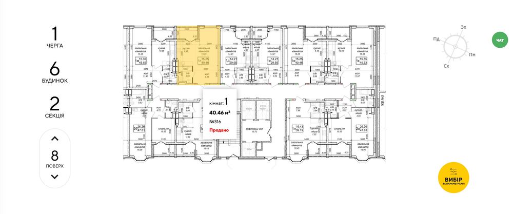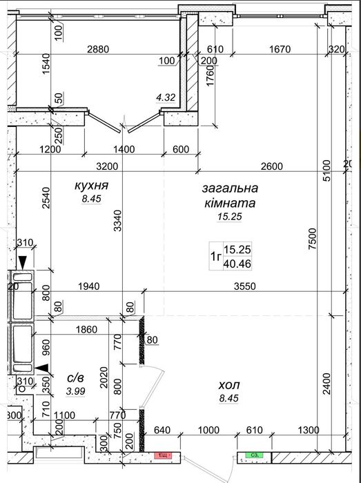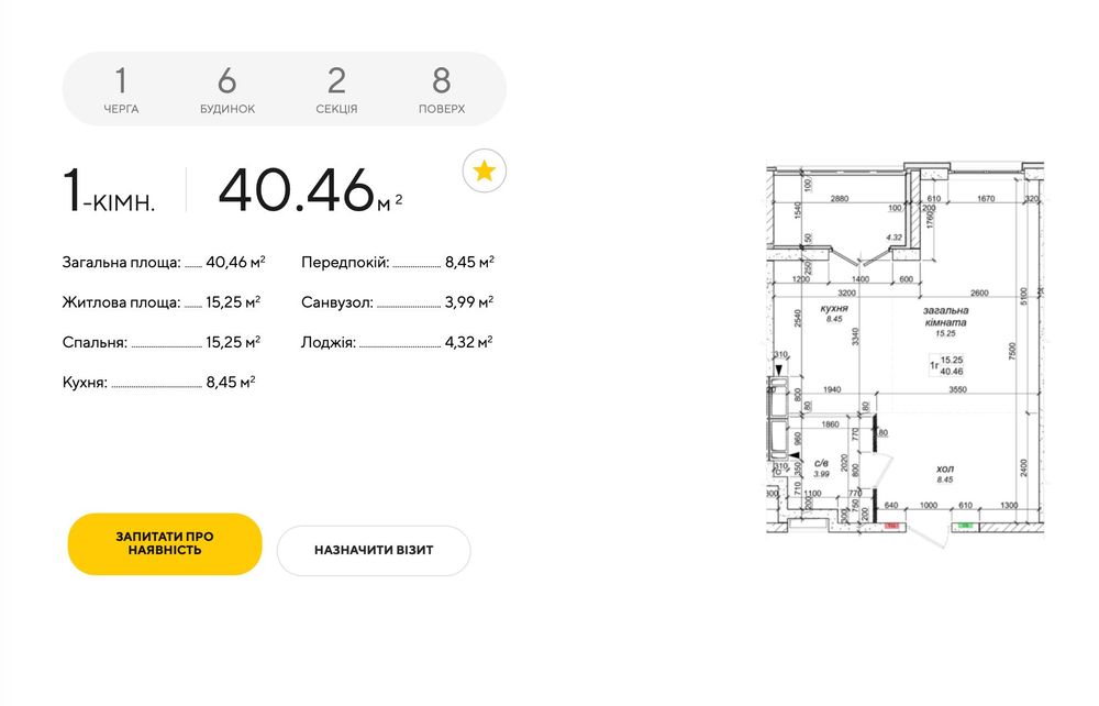 Загальна площа квартири 40.46 кв.м. Житлова площа 15.25 кв.м. Площа кухні 8.45 кв.м.