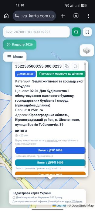 Земельна ділянка, село Шевченкове, Кіровоградська область; Продається земельна ділянка в селі Шевченкове, біля хутора Надія. Площа 41 сотка, ділянка поділена на дві (25 соток під житлову або громадську забудову, 16 соток під сільськогосподарство). Ділянка має вихід на воду, розташована в красивому місці, має асфальтований під'їзд
