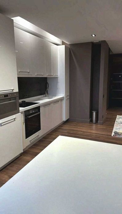 Вбудований гарнітур із глянцевими фасадами. Повністю оснащена сучасною технікою: варильною поверхнею, духовою шафою та іншими необхідними приладами.