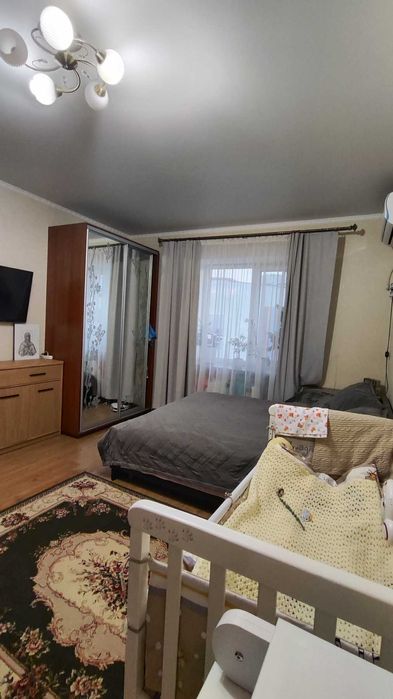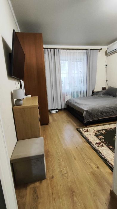 В квартирі є кондиціонер, планування кімнати зручне,можна відділити спальну зону в подальшому. Квартира світла та простора.