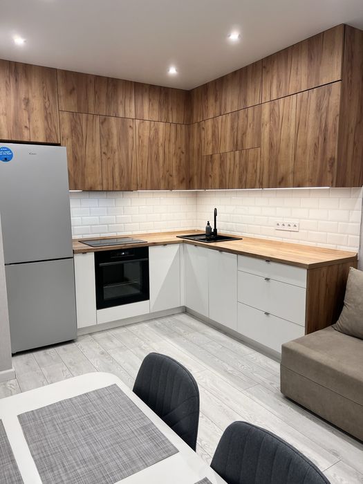 Кухня-вітальня з вбудованою кухнею, розкладний диван, стіл і стільці.