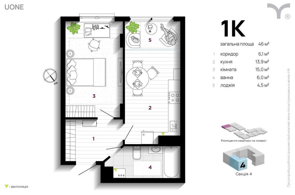 Ідеальний варіант для життя або інвестицію, що зростає в ціні. Пропонуємо простору однокімнатну квартиру в одному з найсучасніших комплексів міста — ЖК UOne.