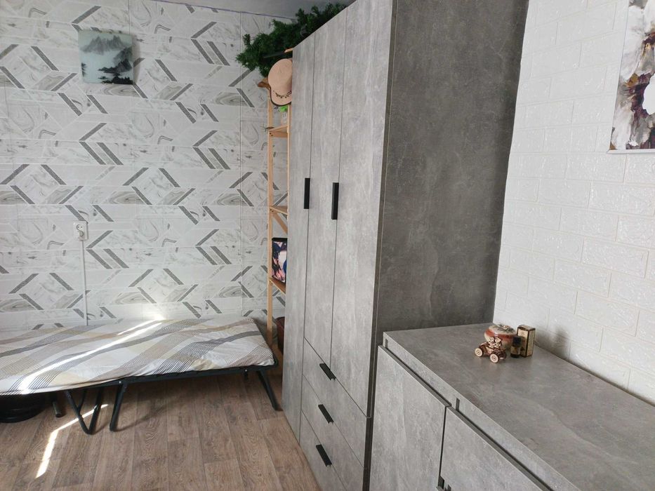 диван-ліжко, розкладачка, нові шафи та комод, столи, кухонна зона (барний стіл і комплект стільців)