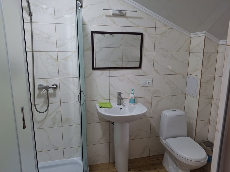 Туалет з душовою кабіною, умивальником та бойлером.