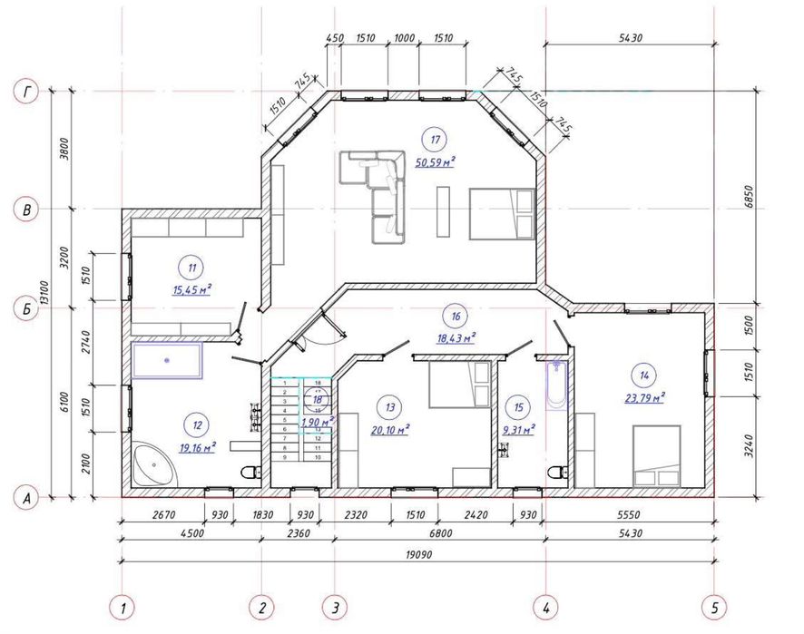 1 поверх: вітальня, простора кухня з виходом на терасу, гостьова спальня (або кабінет), гардеробна кімната, с/в, пральня, котельня.