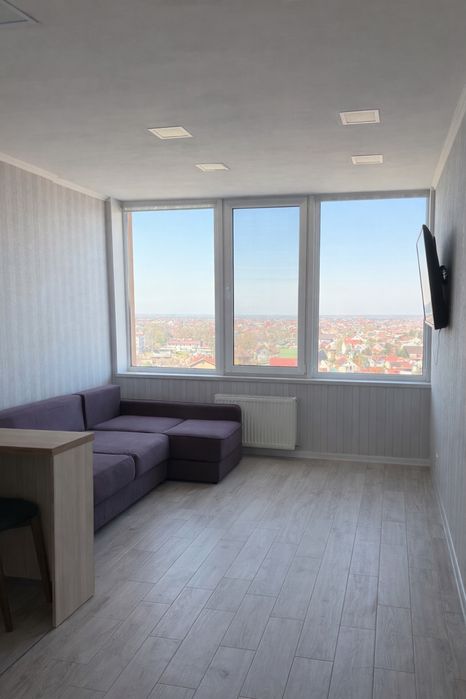 Затишна світла квартира з виглядом на приватний сектор, який не забудується, з неймовірними заходами сонця. Планування - просторий коридор, містка кладова, санвузол з ванною, спальня кімната з вбудованою гардеробною, велика кухня-студія з напів панорамними вікнами. Сучасний ремонт.