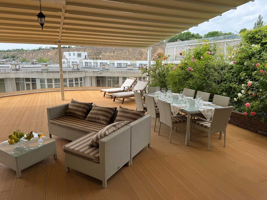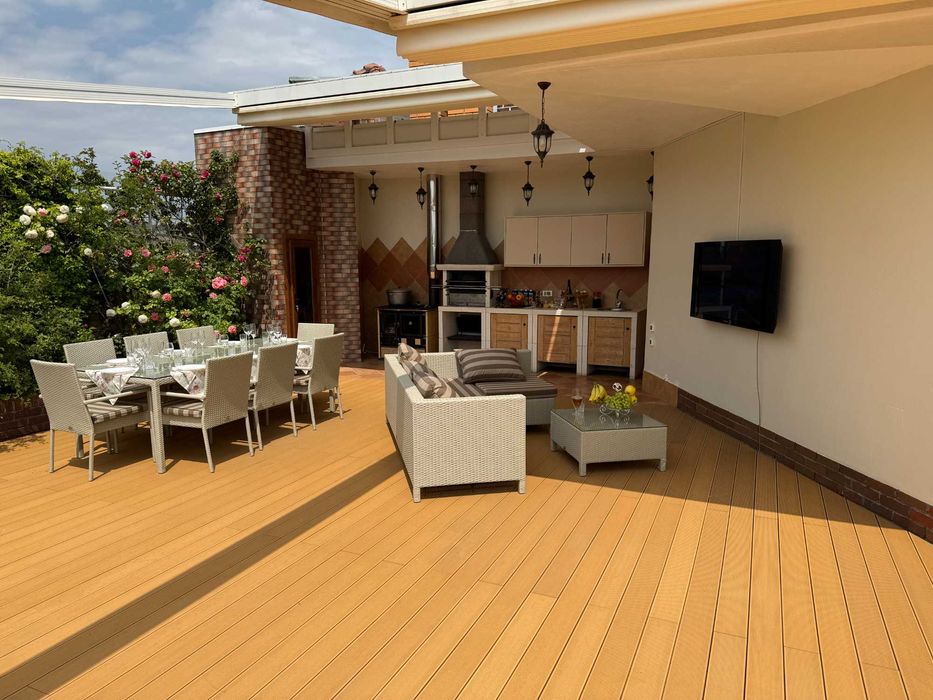 Панорамна тераса (3-й поверх): 114 м² з прямим видом на море. Покриття — дошка Megawood (ДПК), система Pergola з дистанційним керуванням та освітленням.