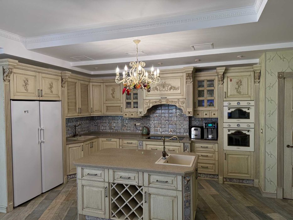 Ексклюзивні матеріали: Міжкімнатні двері з художнім розписом, сходи та кухонний гарнітур виконані за індивідуальним замовленням (ручна робота, масив дуба).