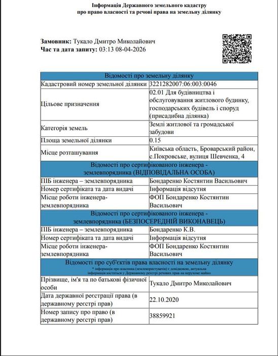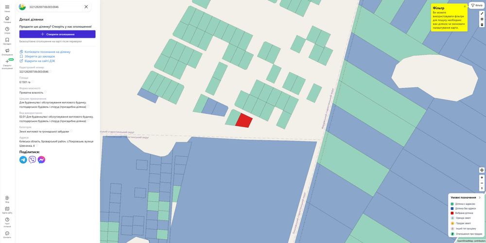 Земельна ділянка Куйбишеве (нвова Покровське) під забудову; Продам земельну ділянку 15 соток під забудову житлового будинку в с. Покровське, Броварський район, вул. Шевченка, 4. Ділянка правильної форми, рівна, без забудови, зручна для будівництва. Цільове призначення — для будівництва і обслуговування житлового будинку (02.01). Приватна власність, кадастровий номер присвоєно. Тихе місце. Продаж від власника, можливий торг.Ціна вказана за всю ділянку.