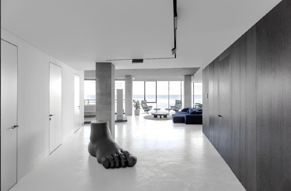 Геометрія приміщення візуально нагадує морську мушлю: звужена в зоні входу та поступово розкривається до панорамних вікон. Із несучих конструкцій у просторі були лише бетонні колони та зовнішні стіни. Виходячи з цього, архітектори запропонували принцип зонування: приміщення, які не потребують прямого сонячного світла, зосереджені ближче до входу, тоді як кухня та вітальня — максимально відкриті, просторі та наповнені світлом. Завдяки цьому вид на море відкривається одразу з моменту входу в апартаменти.