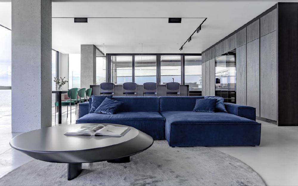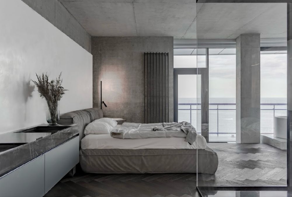 Інтер’єр виконаний у мінімалістичному стилі — з чіткими лініями, стриманими формами та лаконічним декором. В інтер’єрі переважає нейтральна палітра — білий, сірий і чорний кольори в поєднанні з природними відтінками, що перегукуються з кольором моря та гармонійно його доповнюють. Завдяки відкритому плануванню морський пейзаж органічно інтегрується в простір і візуально продовжується всередині приміщення.