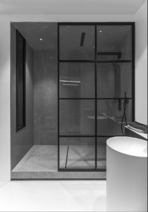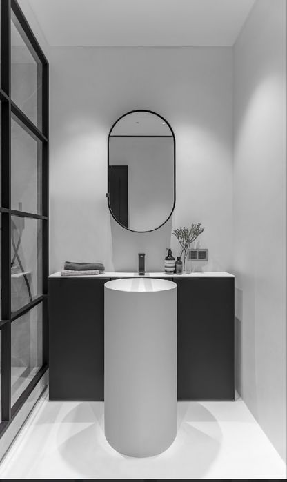 Особливим елементом проєкту є білосніжна підлога, що займає близько 70% площі квартири. Вона виконана з відносно нового на ринку матеріалу Baxab, стійкого до подряпин і забруднень. Під покриттям інтегровано систему теплої підлоги. Значна частина стелі залишена у вигляді відкритого бетону, що підкреслює сучасний характер інтер’єру. У зонах із гіпсокартонними конструкціями приховано всі інженерні комунікації.
