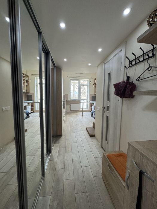 • Інженерний підхід: Це не просто ремонт, а продуманий простір. Велика дзеркальна шафа-купе «у підлогу» (з місцем для сезонних речей), барна стійка та зручне спальне місце.