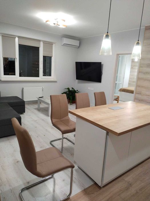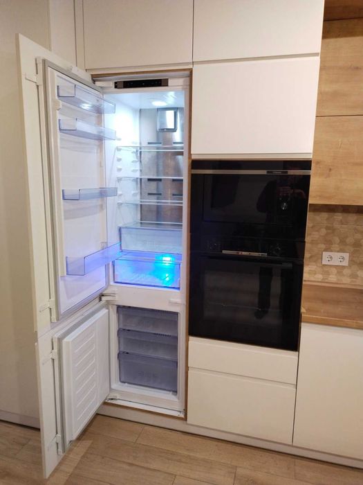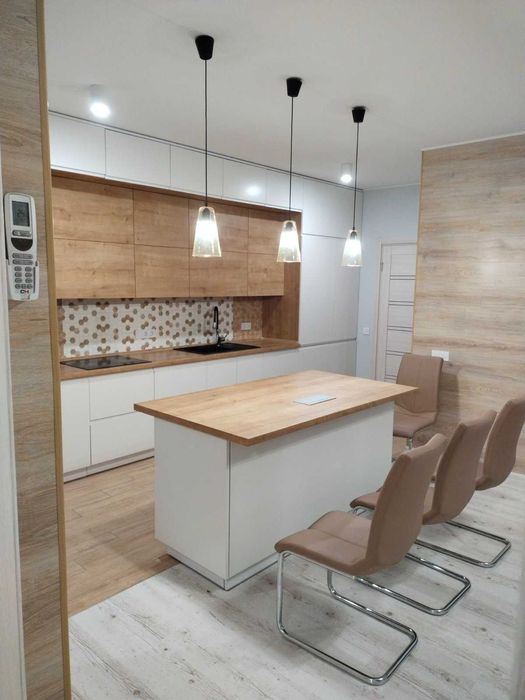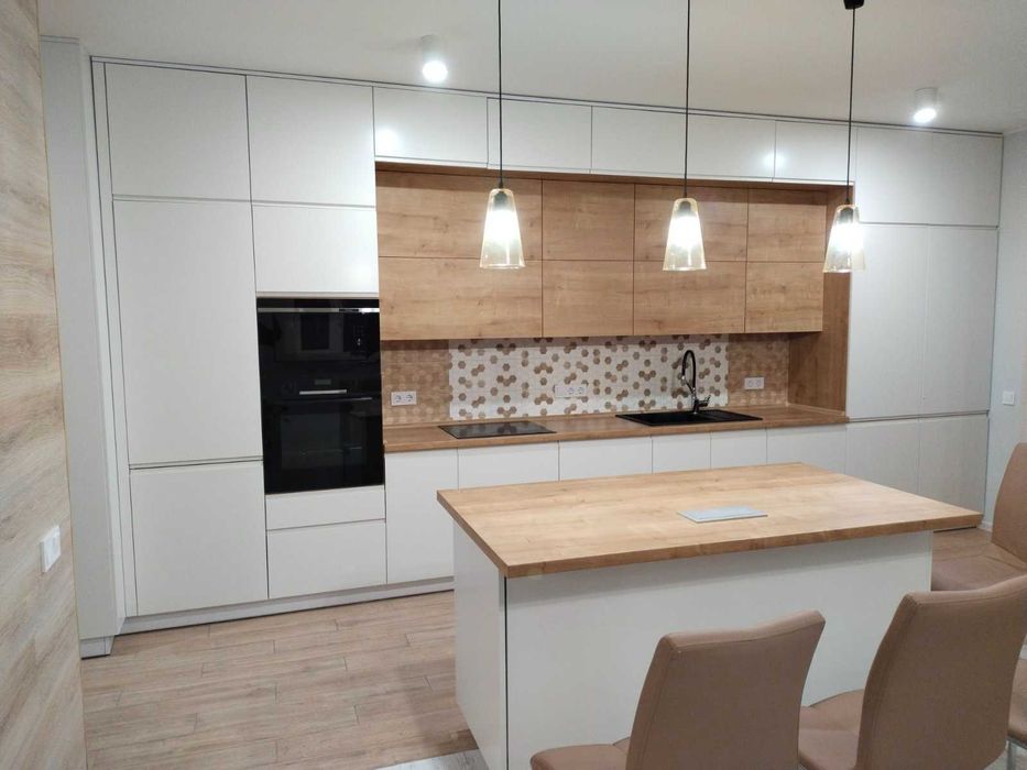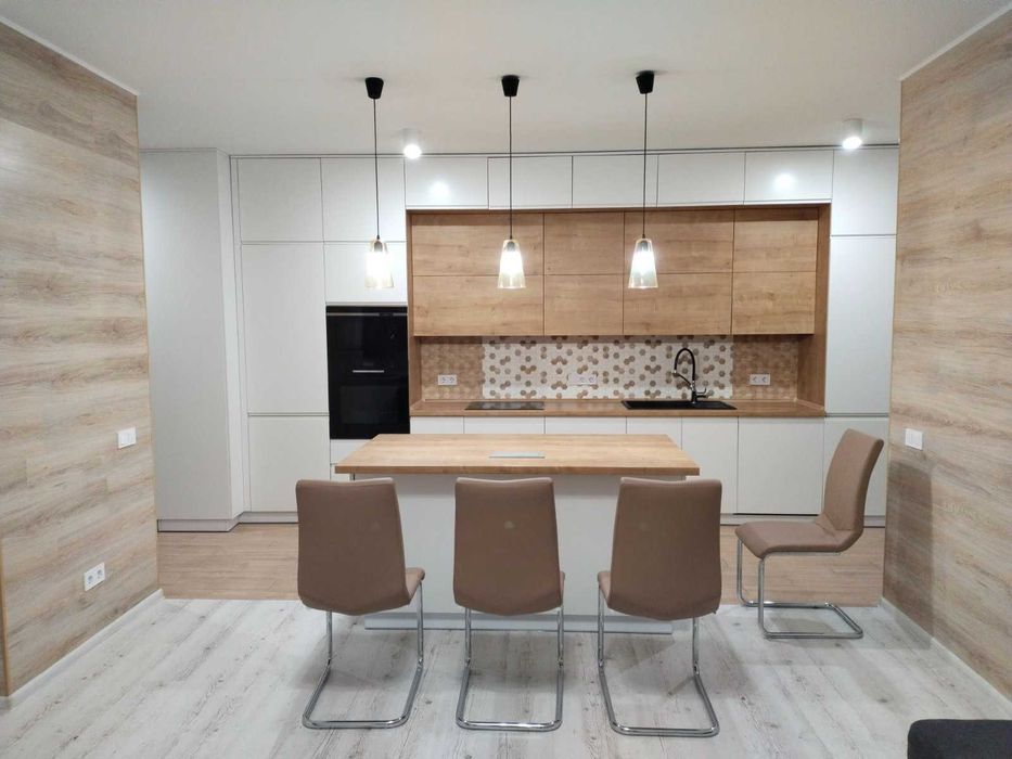 - Велика кухня з островом та вбудованою технікою - індукційна плита, духова піч, мікрохвильова піч, велика посудомийна машина(60см), витяжка, вбудований холодильник.
