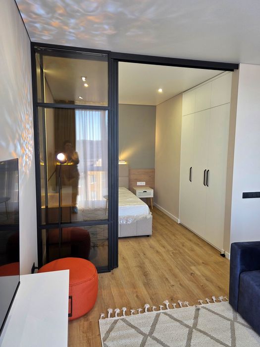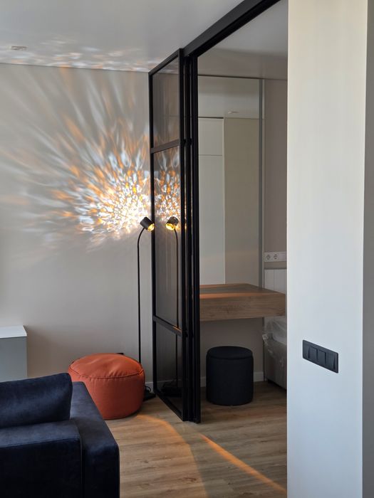 — Грамотне планування: Простір розділений на затишну спальню та простору вітальню-студію за допомогою стильної скляної перегородки — це зберігає об'єм та природне світло в усьому приміщенні.