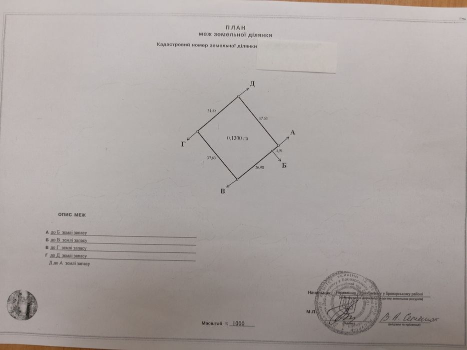 Недвижимость, земля; Продам свой приватизированный участок 12 соток в с. Русанов Броварского района Киевской обл. До Киева 40 км., до Броваров 10км. Участок ровный, прямоугольной формы 32*38 без деревьев и мусора, в действующем садовом товариществе. В живописном, тихом месте. Рядом есть шикарный, огромный грибной лес, река Трубеж, красивое большое озеро, карповый став. Дорога асфальтированная. Через садовое товарищество, а также рядом по трассе Киев - Прилуки регулярно ходят маршрутки. Отличное место для постоянного проживания /дачи/, пикников и загородного отдыха. Я собственник, без посредников. Гос акт на землю в наличии. Имеется возможность увеличить размер участка /от линии фасада длиной 32 метра удаление до кромки асфальтированной проезжей части 20 метров/. Цена участка 5600 у.е. Реальному покупателю торг. За трансформаторную подстанцию и за линию электропередач по садовому товариществу доплачивать не придется /включено в цену участка/.