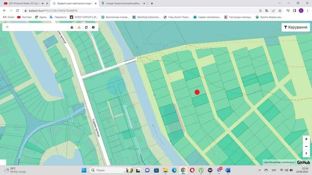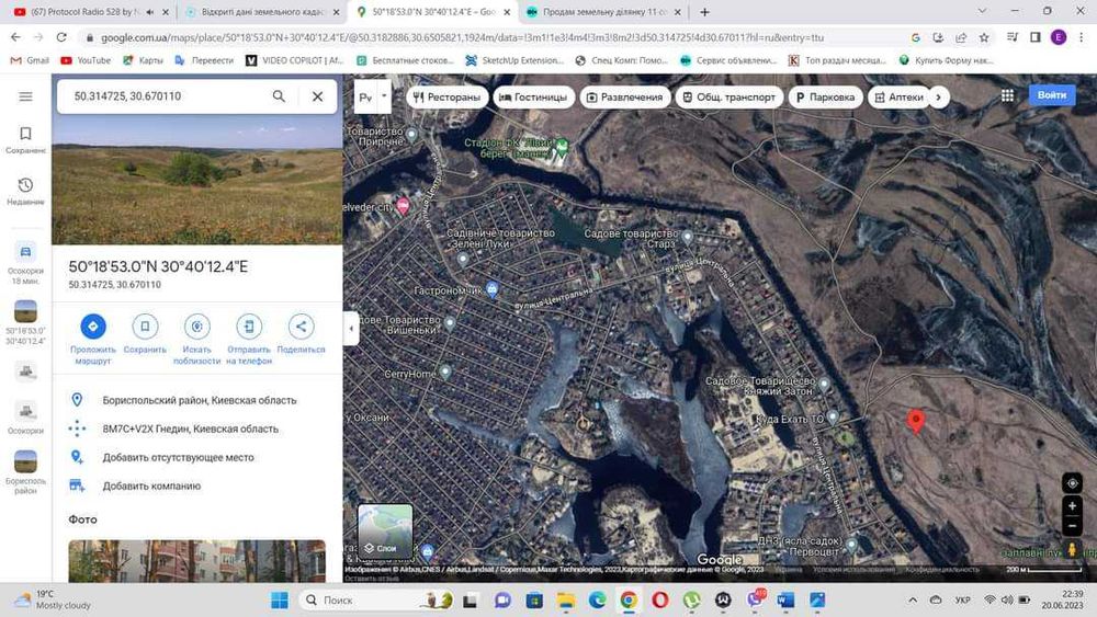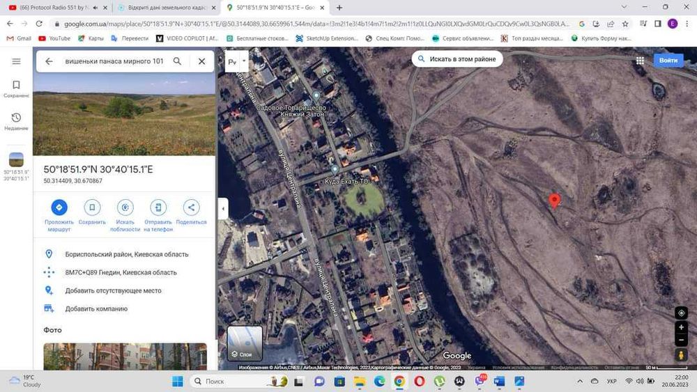 Земельна ділянка Вишеньки; Продам земельну ділянку в селі Вишеньки, Бориспільського району, яка знаходиться між першим та другим шлюзами. Ділянці присвоєна адреса вул. Панаса Мирного, 101. Координати ділянки 50******** 30.670110