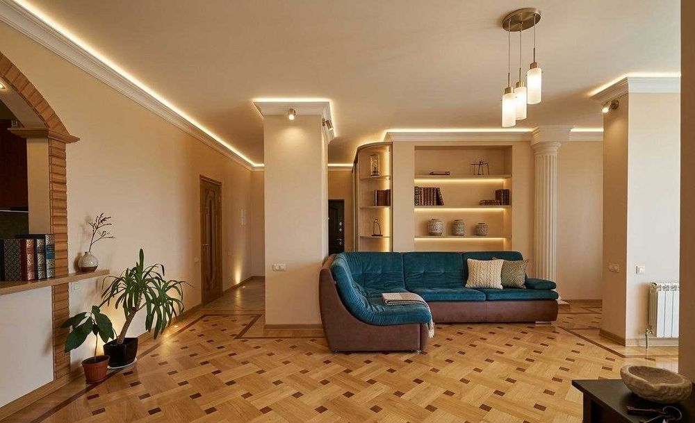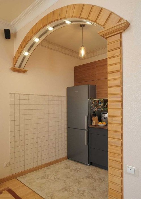 * Масив дерева: На підлозі — розкішне поєднання дуба, ясена та екзотичного мербау. Двері, плінтуси та декоративні арки виготовлені за індивідуальним замовленням з натурального дуба.