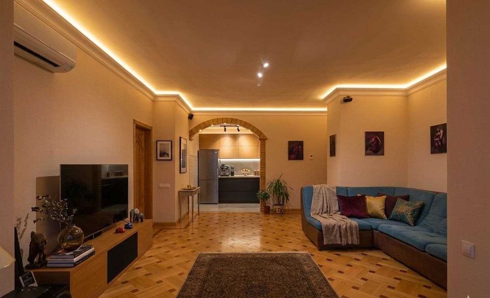 Висота стелі — 3 метри, що в поєднанні з площею 84 м² створює атмосферу заміського будинку в самому центрі мегаполіса.