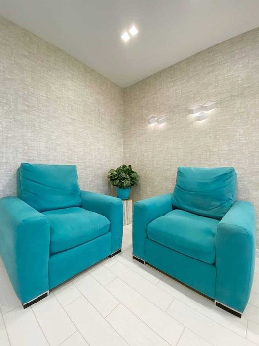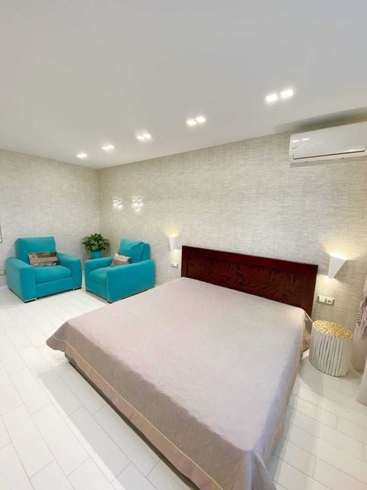 3) Велика спальна кімната з зоною вітальні, яка, крім ліжка, мебльована якісними м'якими кріслами, кондиціонером і телевізором;