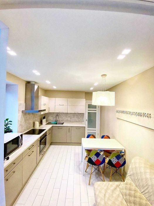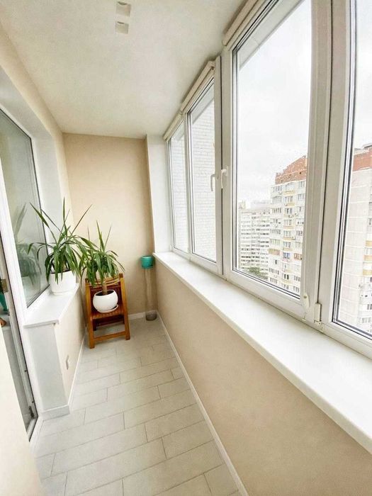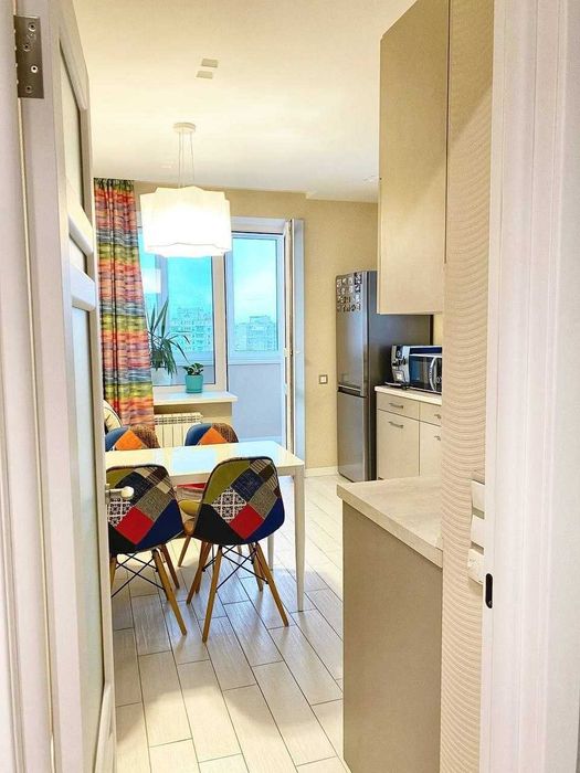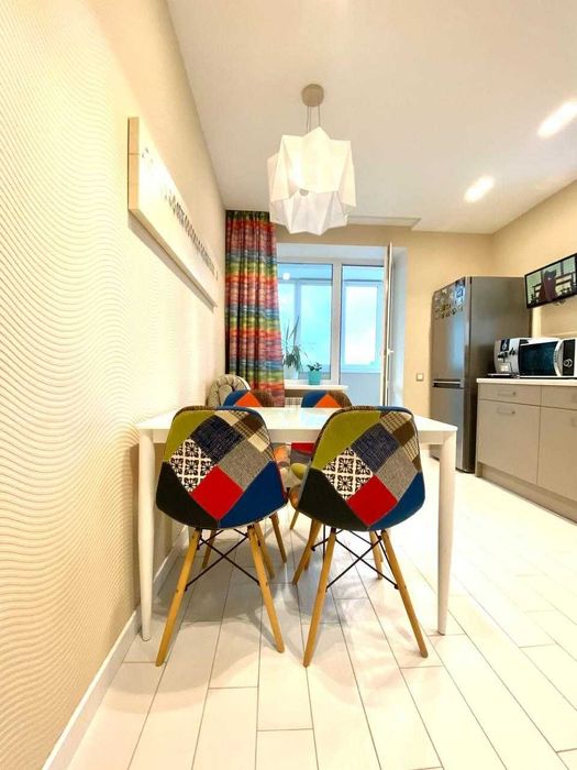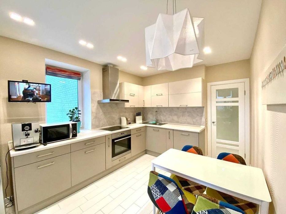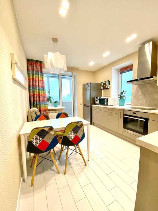 1) Велика кухня (14м2) має засклений балкон та додаткове вікно, що робить її надзвичайно світлою і затишною.
