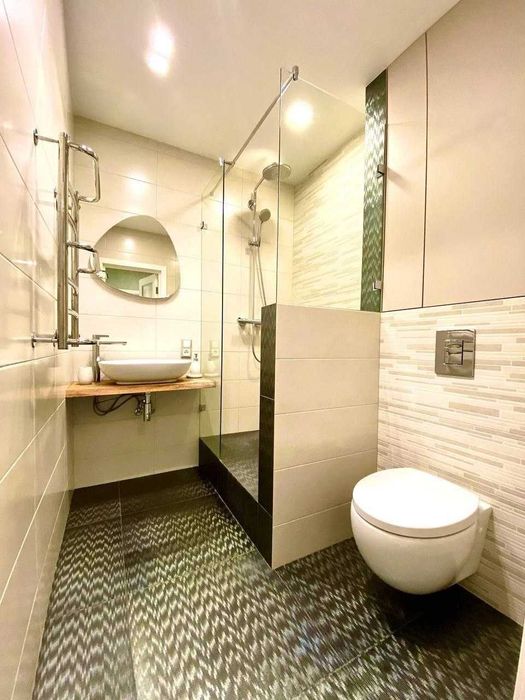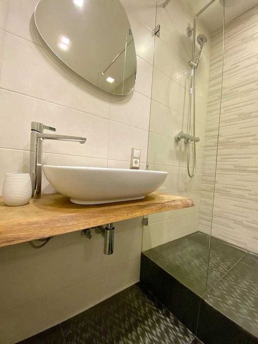 5) Сучасний стильний санвузол із душовою та стільницею із натурального дерева;