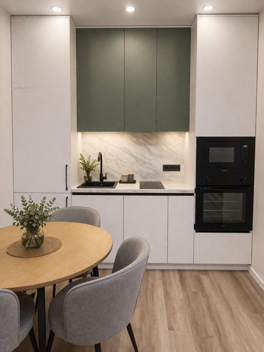 – вбудована кухня з технікою (посудомийна машина, духова шафа, мікрохвильова, витяжка, холодильник, варильна поверхня)