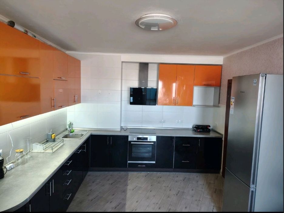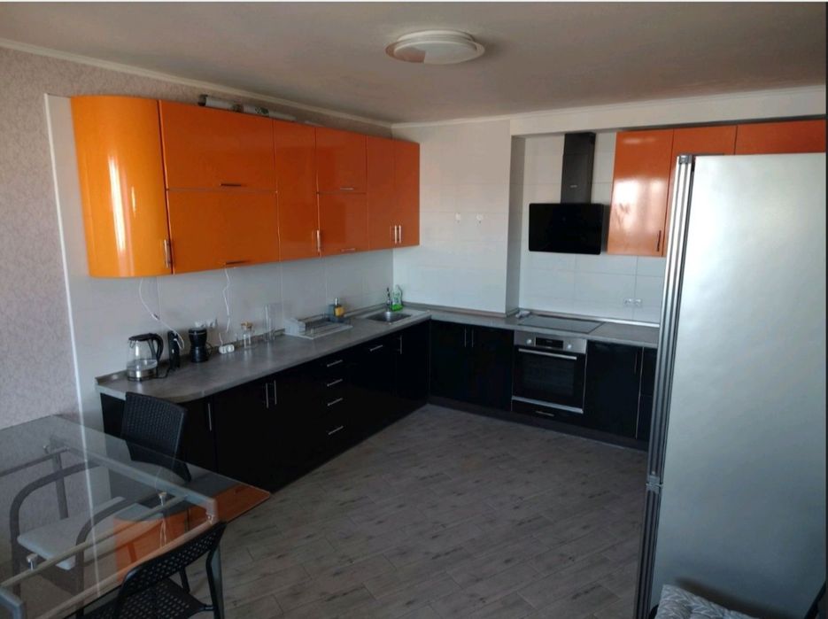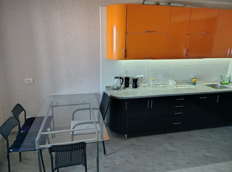 Стильна кухня: Яскравий сучасний гарнітур у соковитому помаранчевому кольорі. Кухня оснащена всією необхідною технікою: варильна панель, духова шафа, витяжка та холодильник. За потреби є можливість встановити посудомийну машину.