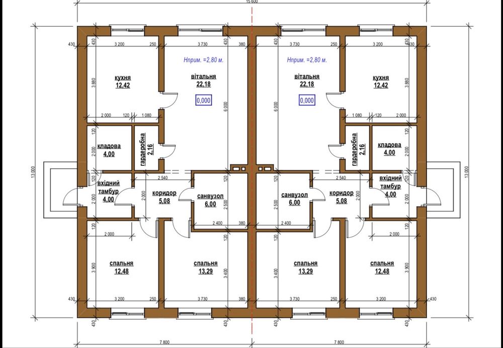 Розмір будинку: 15,6 × 13 м (на дві половини)