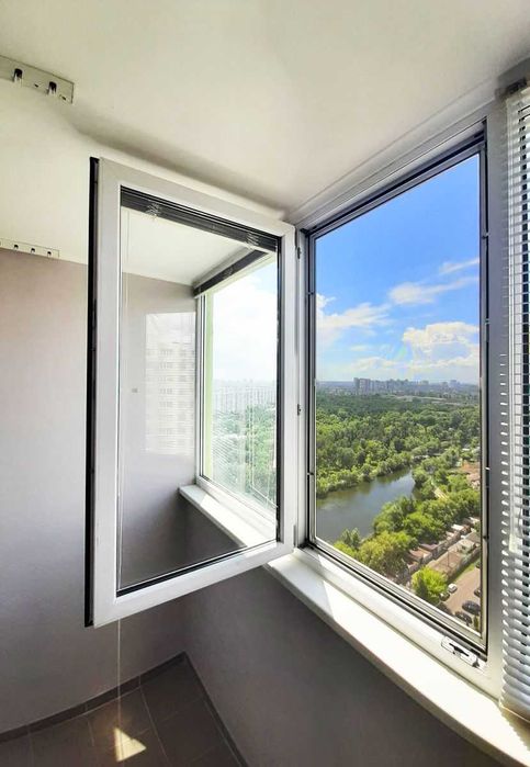 Великі вікна в квартирі та високі стелі роблять її дуже світлою та просторою. Дуже гарний панорамний вид на озеро, оточене соснами парку «Перемога» та правий берег.