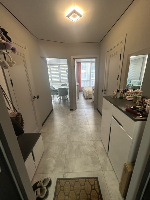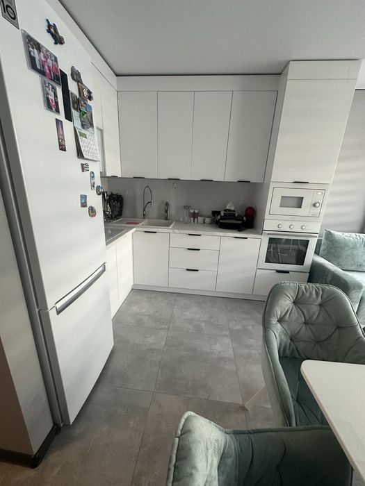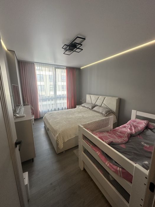 Квартира укомплектована, ( кухня: кухонні меблі, холодильник, мікрохвильова піч, духовка, витяжка, варильна поверхня), кімната: ліжко і тумбочка, гардеробна повністю з меблями, коридор з меблями, ванна кімната теж повністю так як є, побутова техніка ( LG, горенє, самсунг)