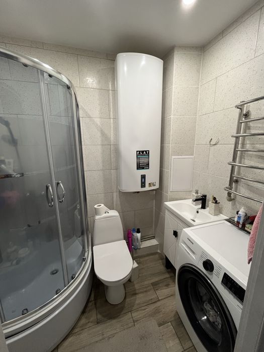 Вана кімната повністю обкладена керамічною плиткою, обʼєднана, що дає більше простору, містить в собі душову кабіну, унітаз, умивальник з тумбою, бойлер, рушникосушарка гаряча від опалення.