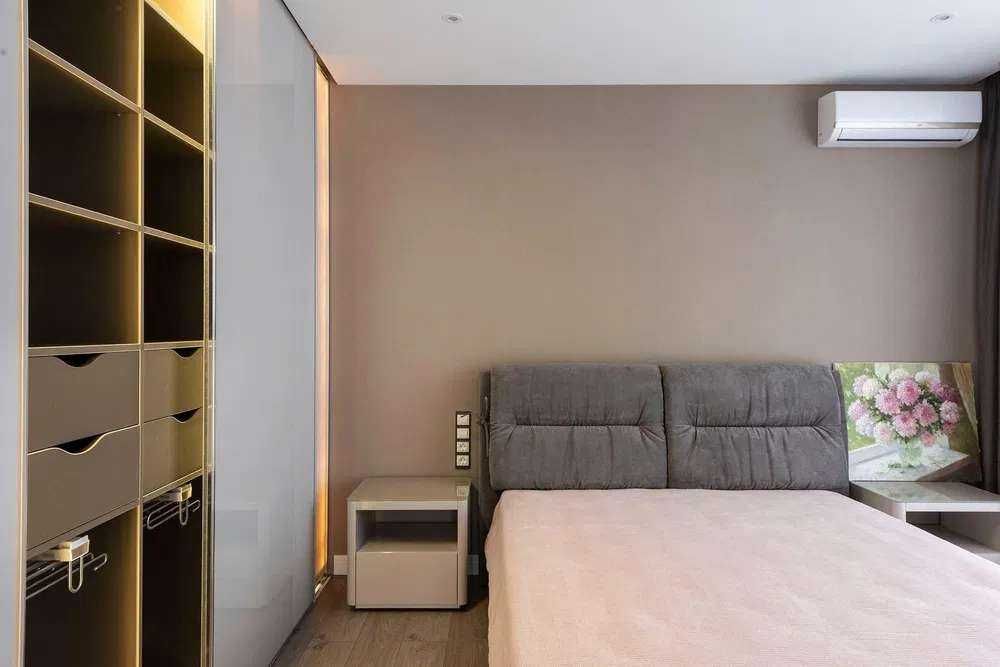 Квартира складається з окремої спальні, кухні- вітальні, санвузла з душовою кабіною та заскленого балкона з виглядом з вітальні. Панорамні вікна орієнтовані на південний схід, тому в квартирі завжди світло і сонячно. Щільні штори дозволяють комфортно спати, не прокидаючись з першими променями сонця. Для зберігання речей передбачені місткі вбудовані шафи.