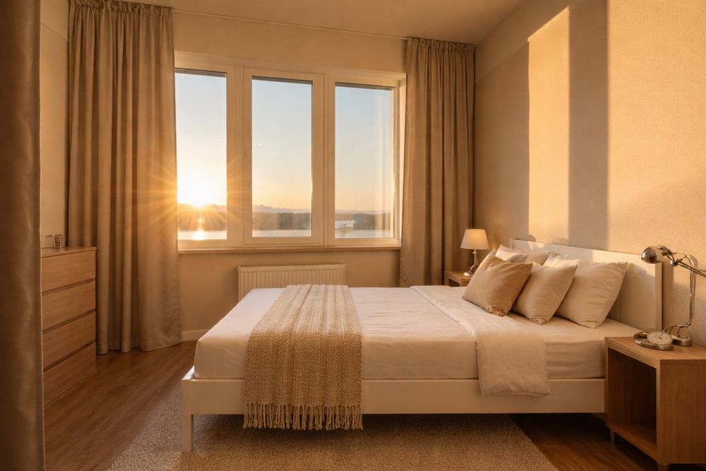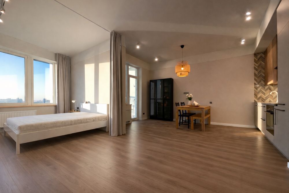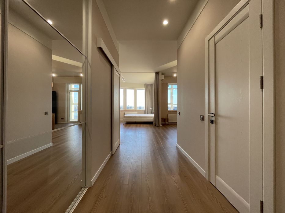 Общая площадь 55 м², 7 этаж. Из окон открывается один из самых красивых панорамных видов на Днепр и правый берег Киева. Это квартира для тех, кто понимает ценность пространства и вида из окна — когда каждый вечер перед вами открываются закаты над Днепром и панорама правого берега Киева.