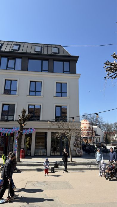Балкон квартири відкриває гарний вид на площу та фонтан — ідеальне місце для ранкової кави або вечірнього відпочинку.
