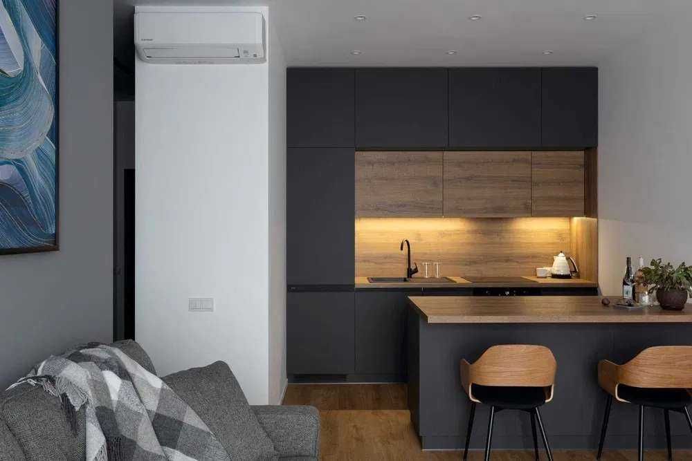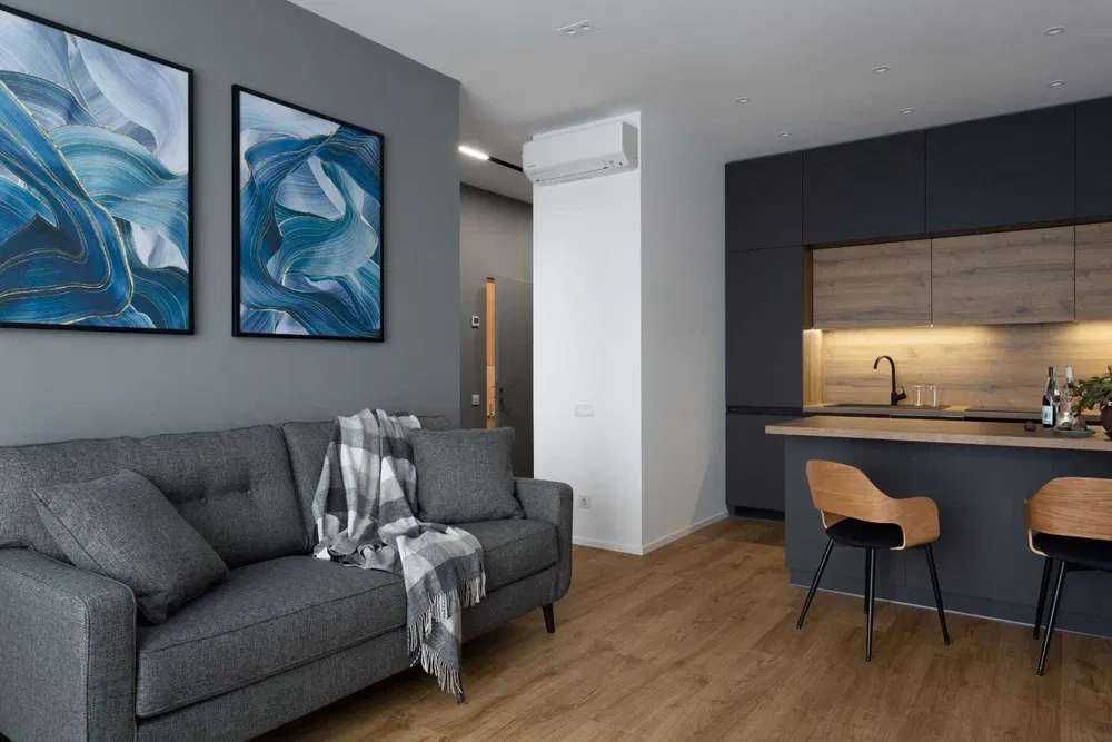 Планування: велика кухня-вітальня та окрема спальня.