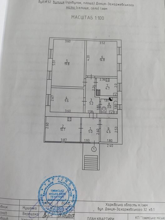 Квартира, Ізюм, біля річки; Загальна площа 76,8 кв. м., житлова - 44,2 кв м. Опис: квартира складається: три житлові кімнати пл. 9,6, 19,8 і 14,8 кв. м., веранда пл. 10,1 кв. м., коридори пл. 5.0 і 5,2 кв. м., кухня 4,7 кв. м., санвузол з ванною пл.3,0 кв. м., комора пл. 4,6 кв. м, погріб.