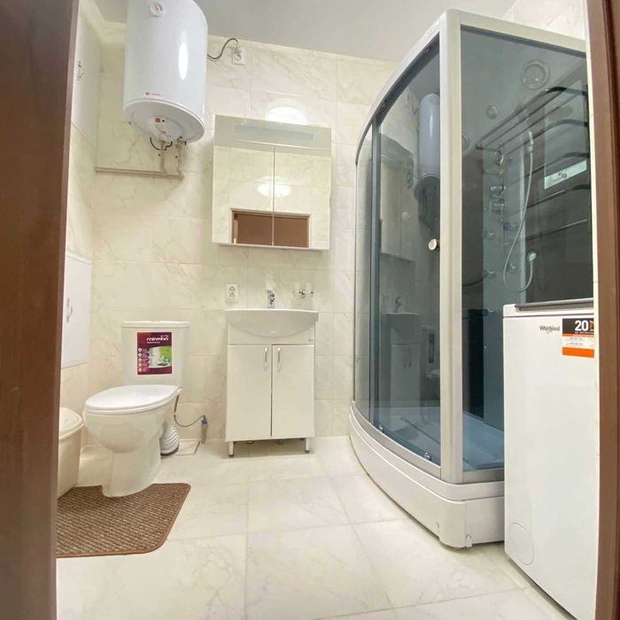 Зона гостиной: письменный стол, настольная лампа, часы-мульти табло, удобный диван. Кухня: телевизор с диагональю 32 дюйма, инверторные: стиральная машина, кондиционер, холодильник - что позволит существенно экономить электроэнергию. Инверторная техника работает практически бесшумно. Стильный обеденный стол, электрочайник, микроволновка, варочная поверхность, вытяжка, кухонные принадлежности. Система умный дом. Теплые полы во всех помещениях.