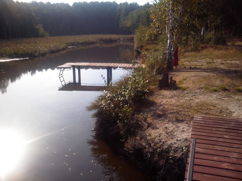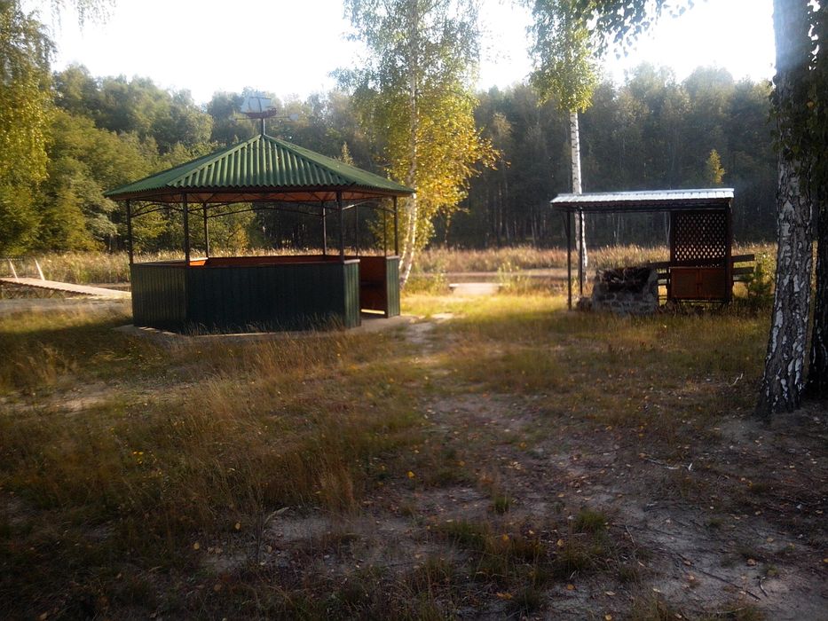 На берегу озера большая беседка с каменным мангалом окруженным хвойным лесом,