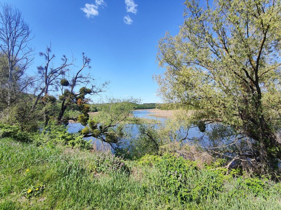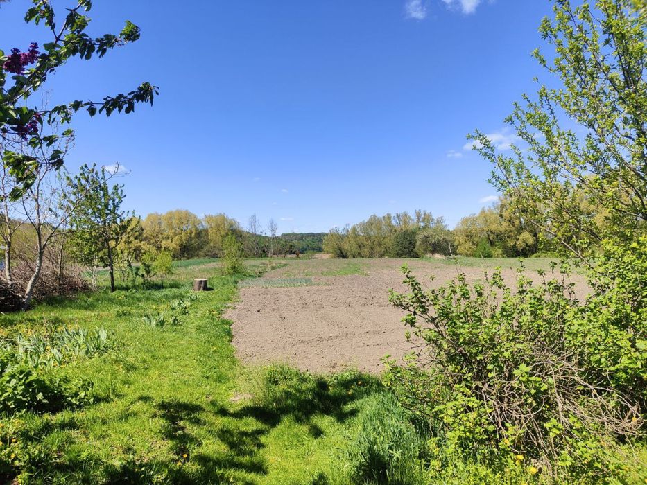 Ділянка- 50 соток з виходом до річки. Є садок ( фруктові дерева, горіхи, кущі смородини,малини) та виноградник.