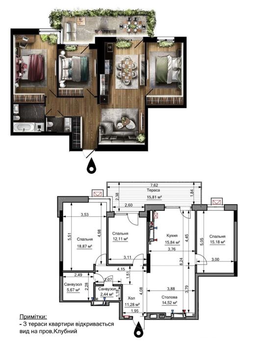 • Два санвузли (2,4 і 5,6 м²)