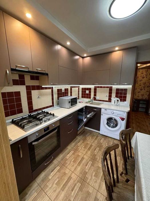 Вбудована техніка на кухні: плита газова, піч електро, посудомийна машина, пральна машина, мікрохвильова піч, електрочайник, є холодильник та бойлер.