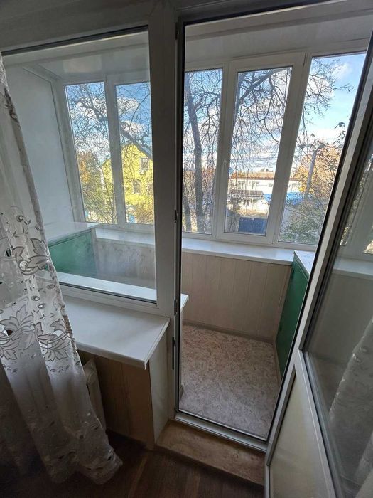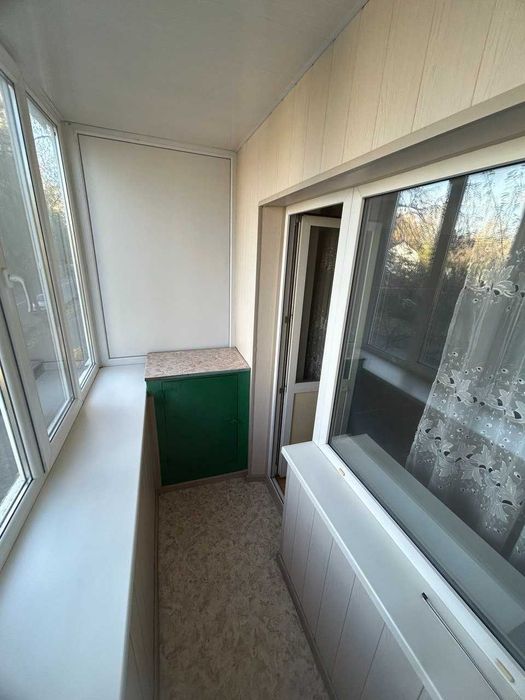 Металопластикові вікна, засклений і обшитий балкон з місткими шафами для зберігання речей.