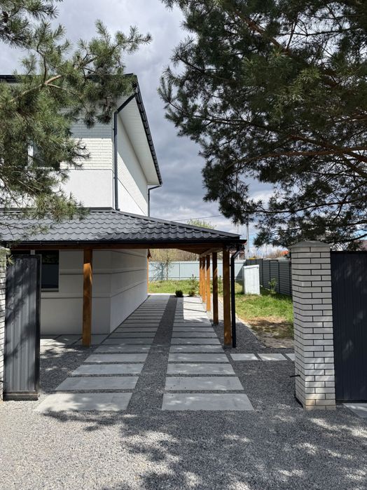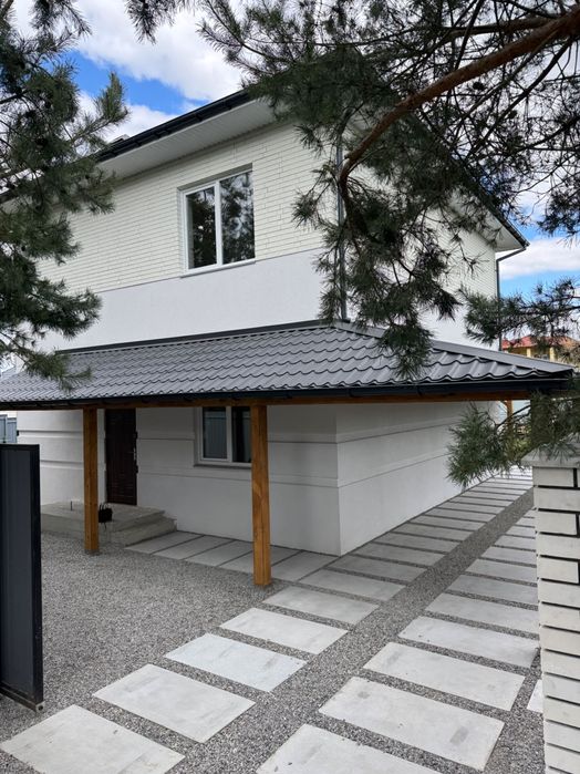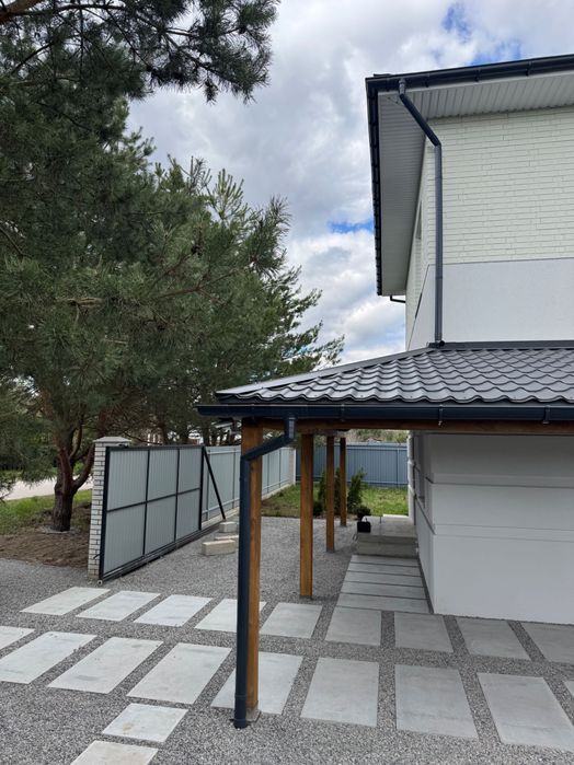 Продається сучасний двоповерховий будинок з терасою в селі Бобриця, Київська область (біля Білогородки), зручний виїзд на Житомирську трасу, 20–30 хвилин до Києва.