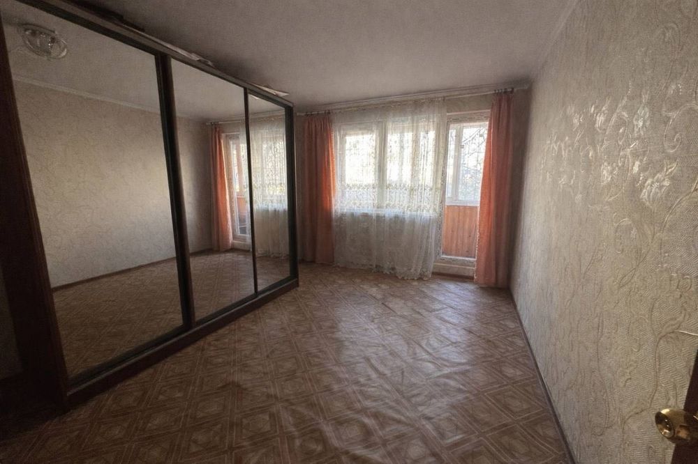 Планування передбачає простору кімнату та великий балкон. У квартирі встановлені металопластикові вікна, стіни підготовлені та вирівняні. Частково залишається меблі та кухня: двоспальне ліжко, шафа-купе та вбудований кухонний гарнітур.